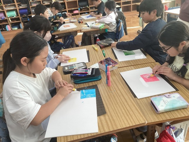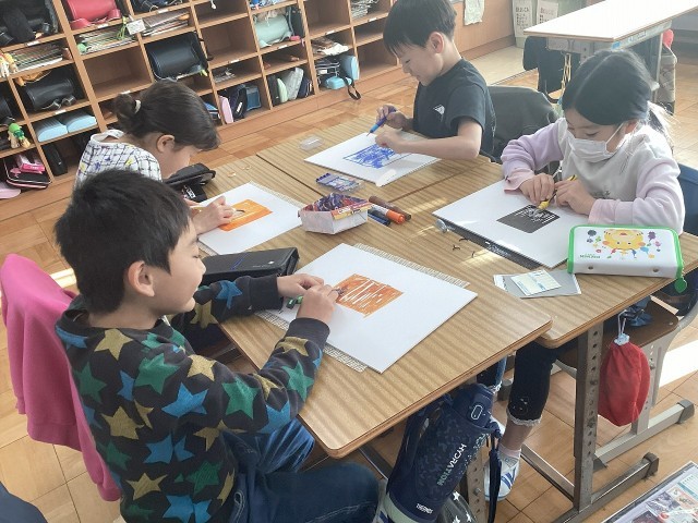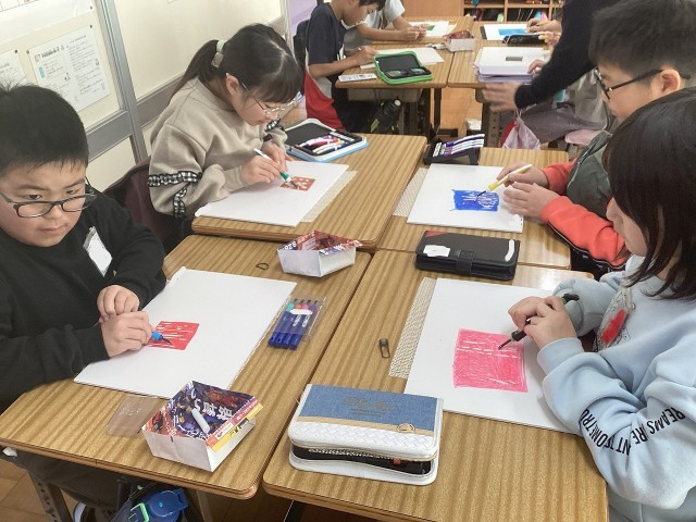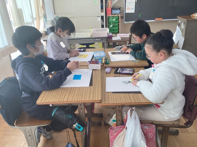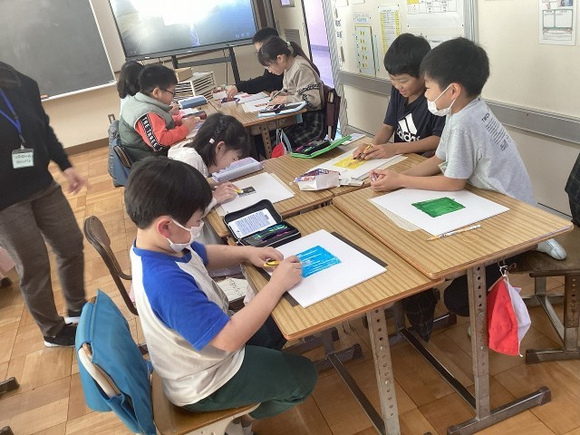 本日の4年1組の図工で、初めて彫刻刀を使った学習を行いました。