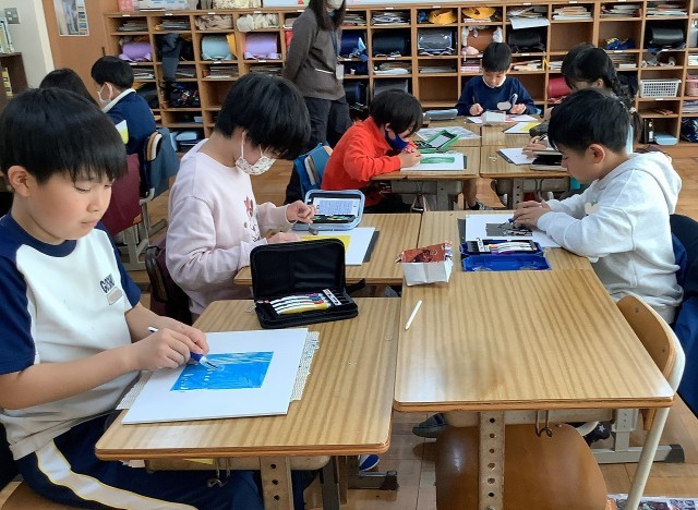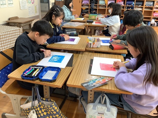 今日は四年二組が図工で初めて彫刻刀を使いました。