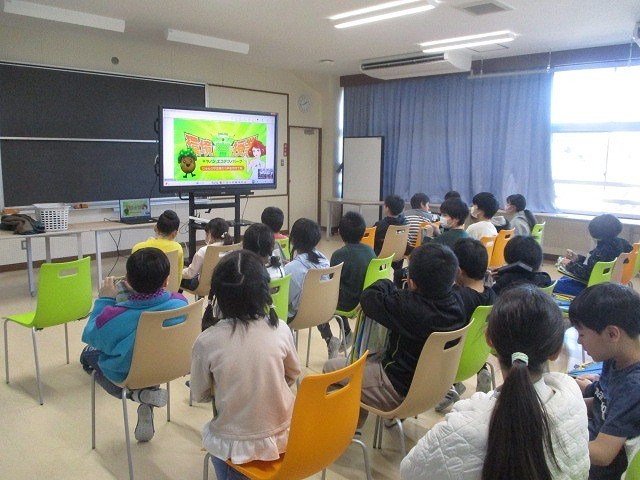 総合的な学習の時間で環境の学習をしました。その学習のまとめとしてプラスチックごみの行方や3R、分別の仕方について話を聞きました。