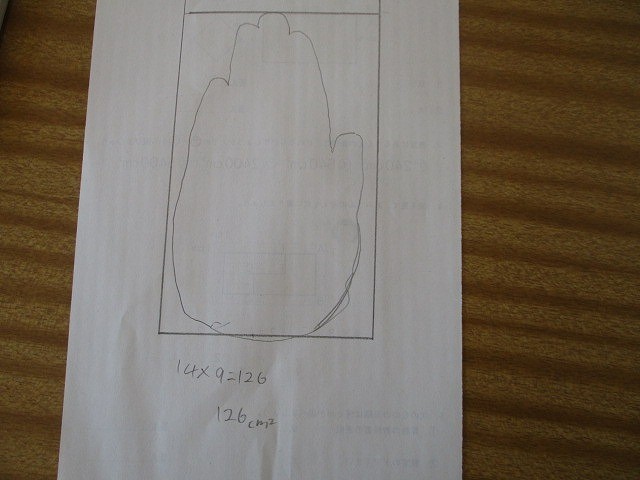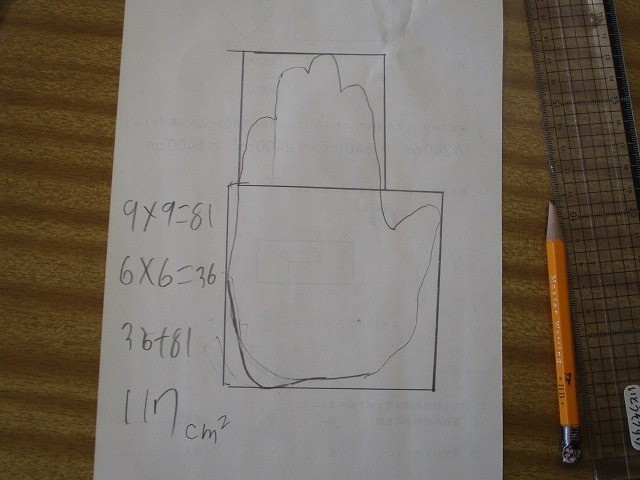また、自分の手の形を写して、長方形や正方形に見立てておよその面積を計算してみました。