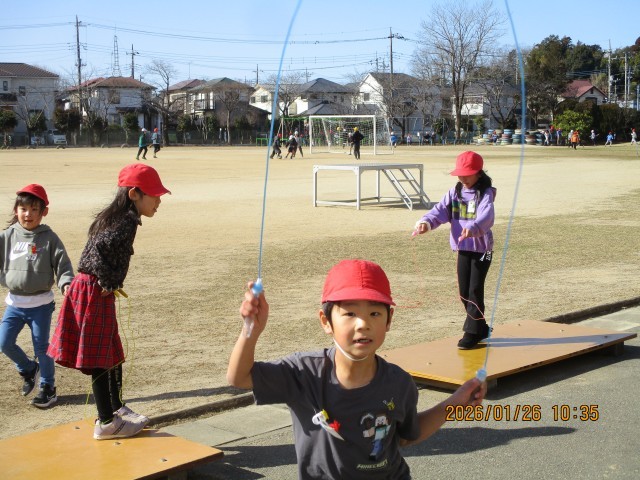休み時間になると、冷たい北風をものともせず、たくさんの子どもたちが元気いっぱいに校庭へ飛び出していきます。今、校庭で一番の盛り上がりを見せているのは、なわとびです。 「前よりも長く跳べるようになったよ!」「新しく二重跳びの練習を始めたんだ!」と、自分の目標に向かって一生懸命に練習に励む姿があちこちで見られます。