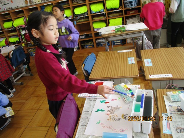 1年生の図工では、クレヨンと水彩絵の具を組み合わせた作品づくりに取り組んでいます。 クレヨンで力強く描いたあと、背景を絵の具で丁寧に仕上げました。入学当初に比べ、パレットや筆の使い方がとても上手になり、準備から片付けまでスムーズにできるようになりました。道具を正しく使いこなし、一人ひとりの感性が光る素敵な作品が仕上がっています。