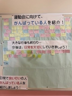 5年生の教室前の廊下には、行事の振り返りや日々の頑張りを称賛する掲示コーナーがあります。そこには、特別な日だけでなく、日常の何気ない思いやりや、コツコツと積み重ねた努力に光を当てたメッセージが並んでいます。自分の良さを認め、誰かの頑張りを喜び合えるこの場所は、子供たちにとって大きな励みになると思います。5年生として過ごす時間も、残りわずかとなりました。この壁がさらにたくさんの「ありがとう」と「頑張ったね」のカードで埋め尽くされるのを楽しみにしています。