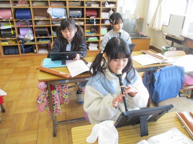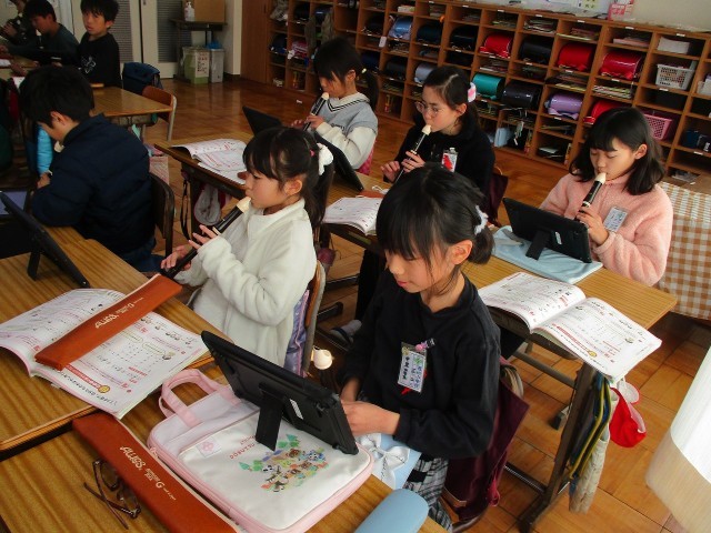 はじめに、デジタル教材でお囃子の旋律をつくり、リコーダーで吹いてみました。すらすら吹けるようになると、楽しい気分になったようです。