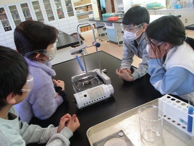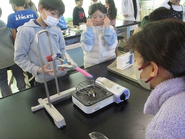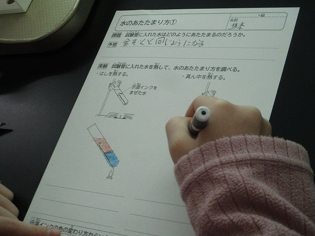 温めるとインクの色が変わること、金属と違って、上の方から温まることに子どもたちは驚いていました。