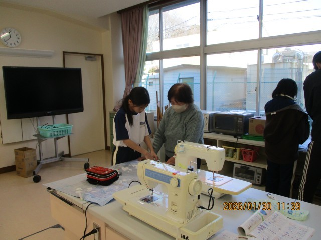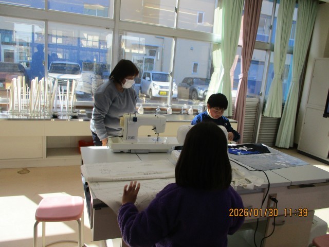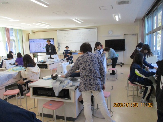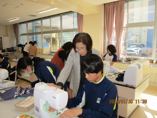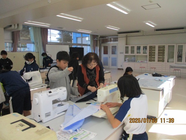 今日のミシンの学習にも、ボランティアの先生方に来ていただきました。1班に1人、先生が入ることで慣れないミシンがけもなんとか進んでいます。寒い中お越しくださり本当にありがとうございます。