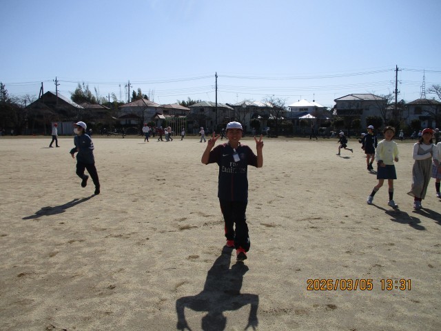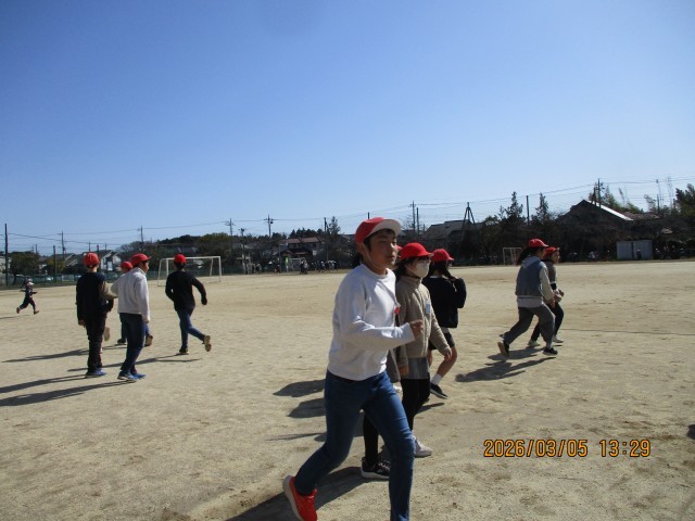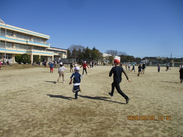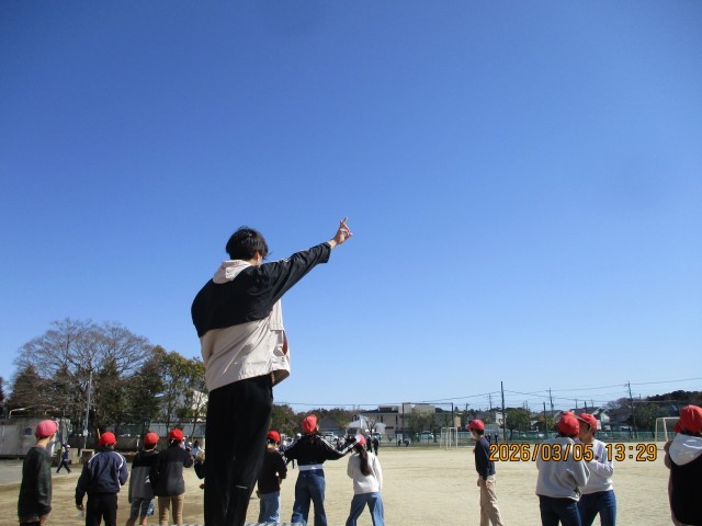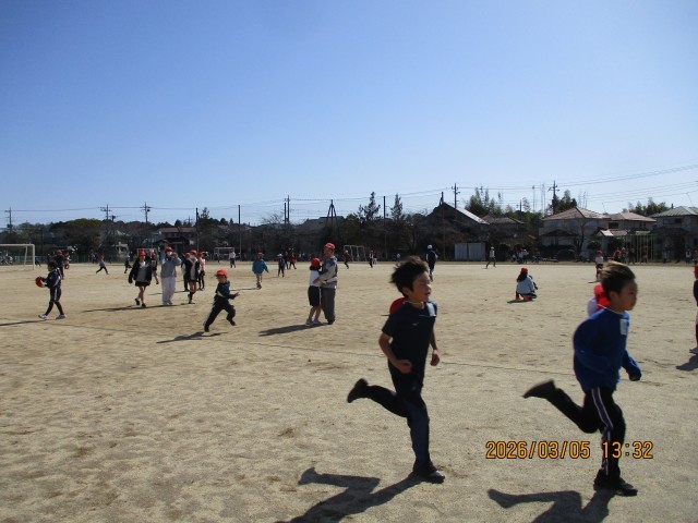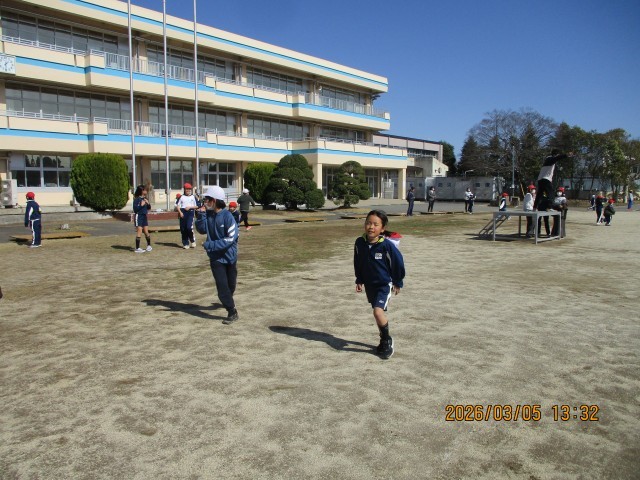 雨で延期され、待ちわびていた「全校鬼ごっこ」が、ついに青空の下で実現しました!6年生が「鬼」となる最終戦。赤い帽子をかぶった6年生が走り出すと、さすがは最高学年。そのスピードは圧倒的で、逃げ回る1〜5年生の白い帽子が、次々と「赤」へと変わっていきます。あっという間にグラウンドが赤一色に染まっていきました。6年生の「強さ」と「かっこよさ」を見せつけ、最高の思い出となりました。