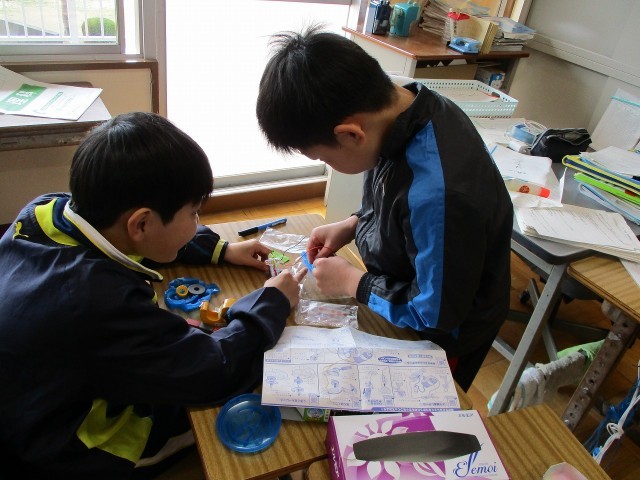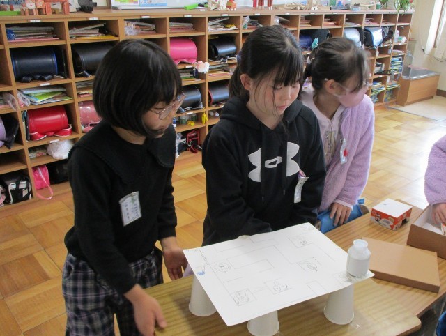 理科では、今までの学習を生かしたおもちゃを作りました。磁石を使った迷路や魚釣り、豆電球の明かりを使った懐中電灯、音が鳴るでんでん太鼓など、素敵なおもちゃがたくさん完成しました。