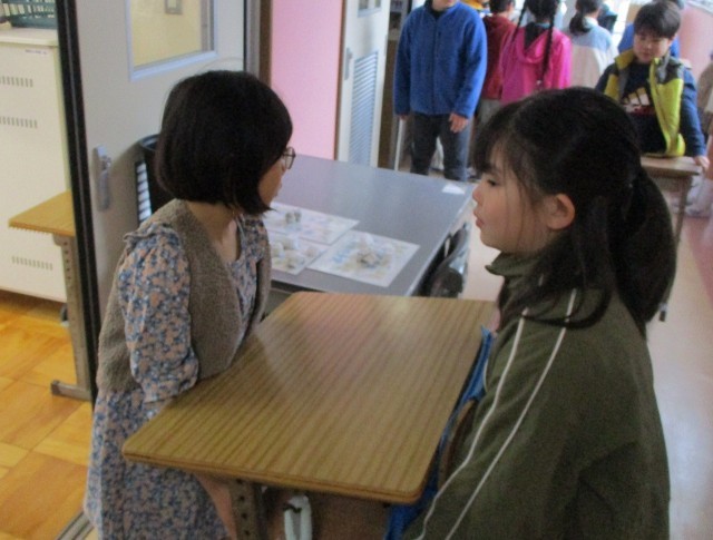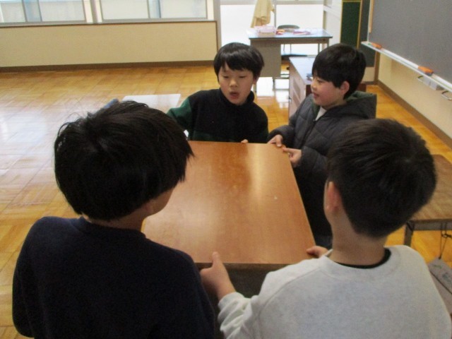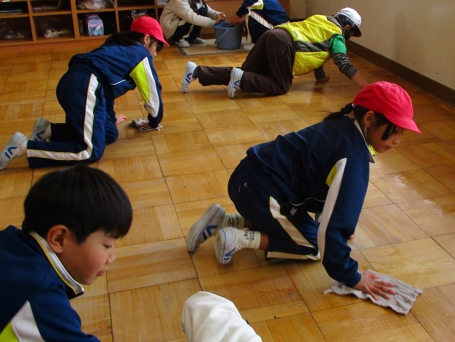大掃除の時間に、全ての机や椅子を教室から廊下に出し、床を掃き水拭きをし、ワックスを塗りました。今日の朝は、廊下に出したものを教室に戻しました。みんなで力を合わせて、けがをしないよう、きれいになった床を傷つけないよう気を付けながら、机や椅子を運んでいました。