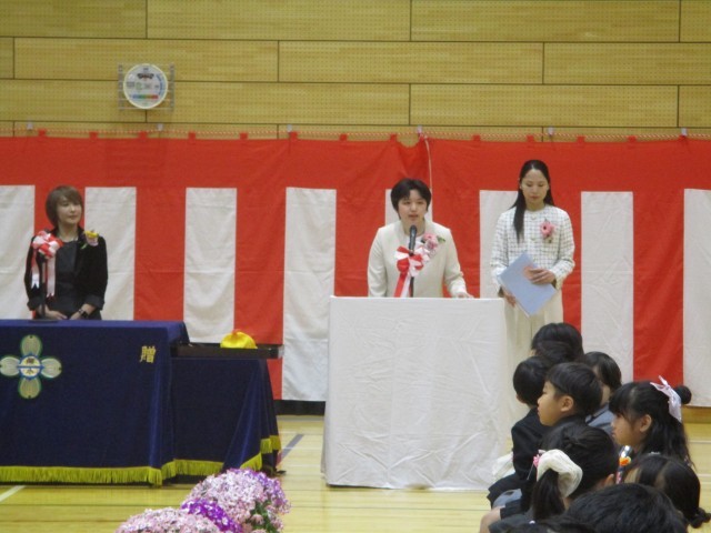 86名の新入生。担任の先生から一人ひとり名前を呼ばれると、緊張しながらも、元気な返事を聞かせてくれました。みんなで声を合わせた「おはようございます」の挨拶も上手でした!明日からは、お兄さん、お姉さんと一緒に、元気いっぱい登校してきてくださいね。