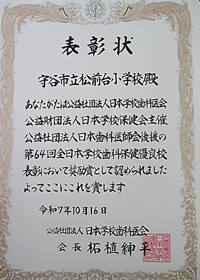第64回全日本学校歯科保健優良校表彰において本校が「奨励賞」を受賞しました。
