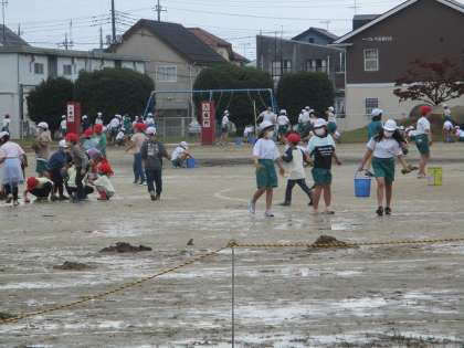10月14日(金)みんなでグラウンド整備 公開日 2022/10/14 更新日 2022/10/14 日常生活 5時間目はみんなでグラウンド整備です。 スポンジで、雑巾で水を吸い取ります。 運動会の為に、みんな本当に一生懸命に頑張ってくれました。 水は殆どなくなりました、明日乾かして、再整備して16日はよい状態で実施したいですね。