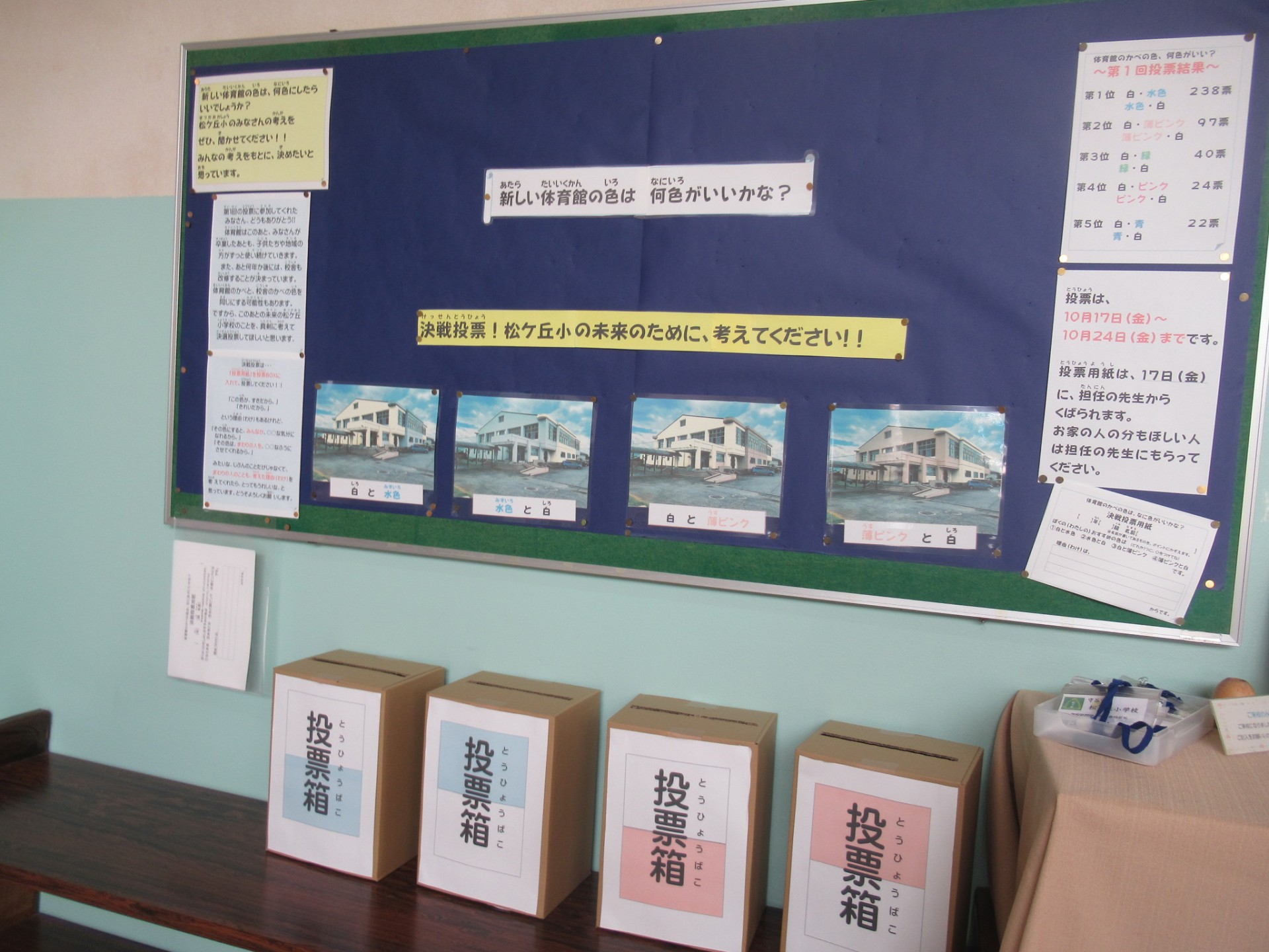 新しくなる体育館の壁の色は何色がよいかな?子供たちの決戦投票中です。何色に決まるか、お楽しみに!!