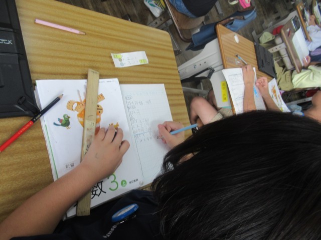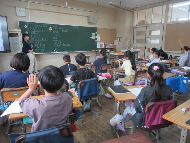 3年生は、自分の考えを、たし算をつかったり、23を20と3の2つの数に分けてからかけ算したり、図を書いたり、それぞれが自分の考えをタブレットに表現し、友達に説明していました。