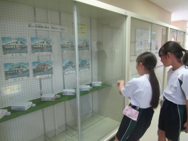 設計事務所の方が、手作りでつくってくれた体育館のミニチュア模型も、1階廊下のガラスケースの中に展示しました。