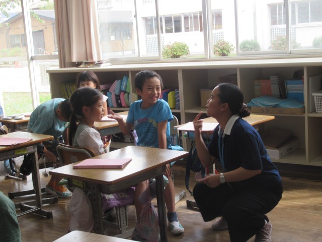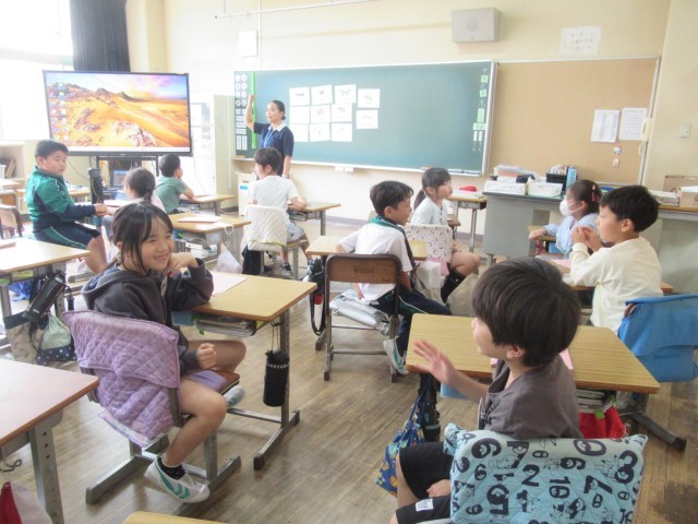 みんなALTの先生の発音をよく聞きながら、元気よくリピートしています。