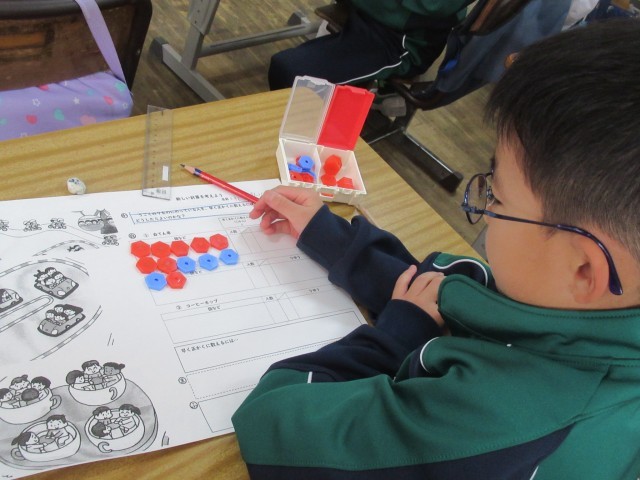 そんな発見から、子供たちは、おはじきをおいたり、図に表したり、数字で示したりしながら。