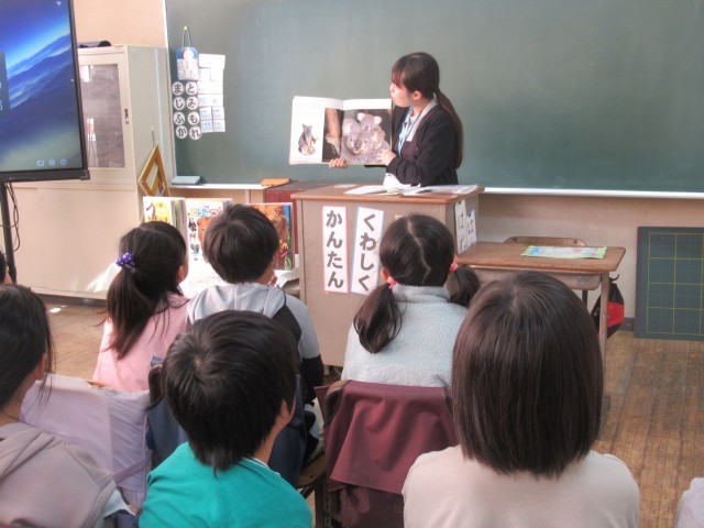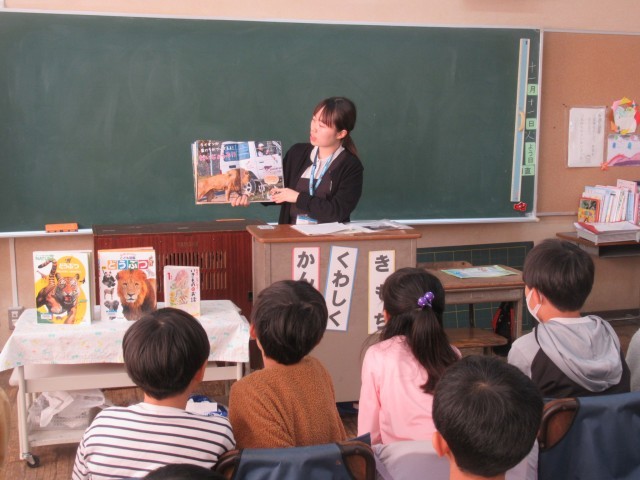 2年生は、国語の時間にビーバーのことを学習したので、動物の秘密が分かる本を、市立図書館の司書さんがピックアップしてきてくださり、紹介してくださいました。