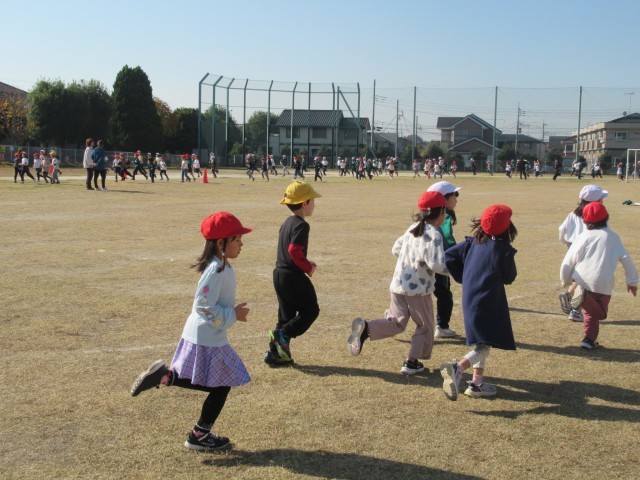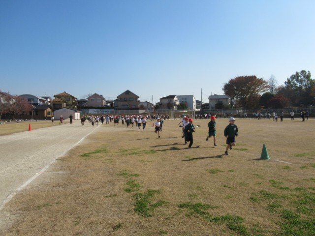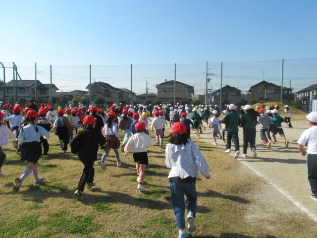 低学年は、一番内側、中学年が真ん中、高学年がいちばん外側を、みんなで同じ方向に向かって走ります。