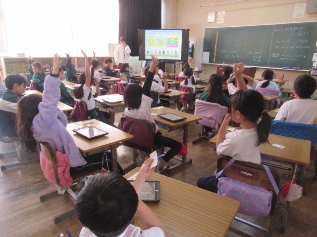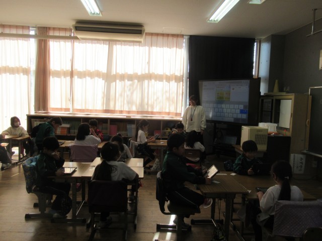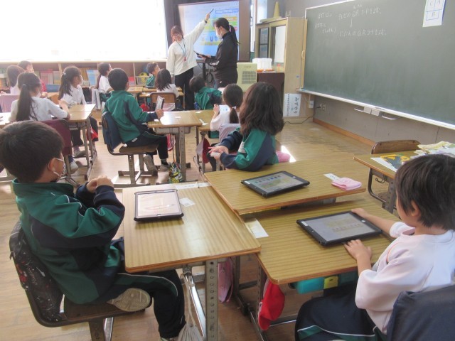 1年生の教室では、子供たちがタブレットを開いて、真剣な表情で操作をしています。