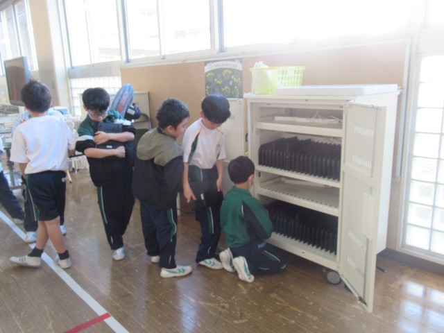 終わりの時間にはきちんと並んで、タブレットを充電庫にしまう1年生。