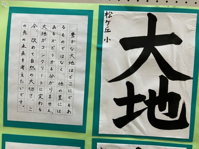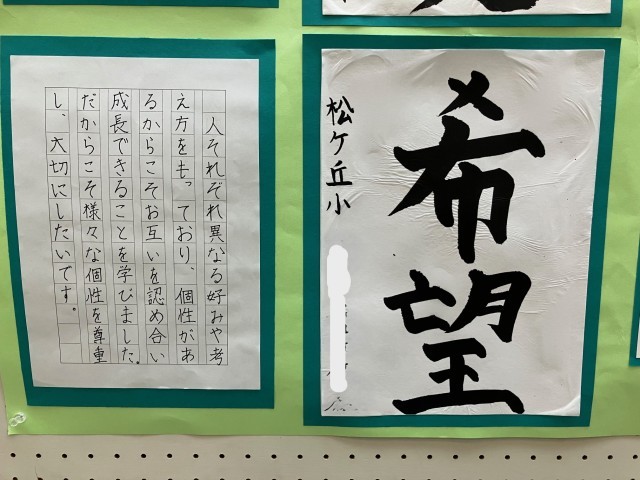 我が松ケ丘小学校からも、書道作品と、人権メッセージの代表作品が展示されています。
