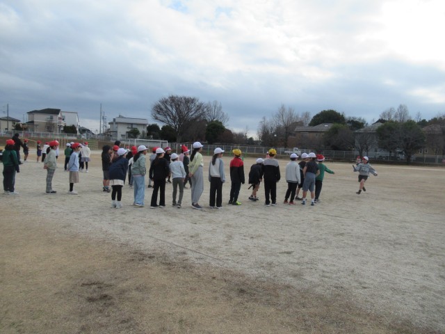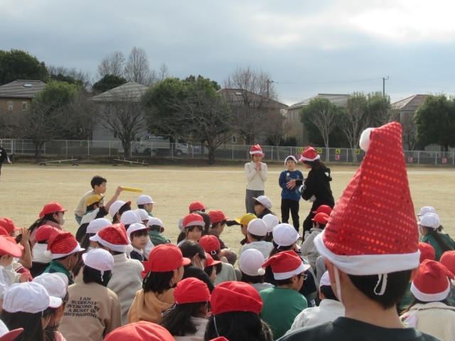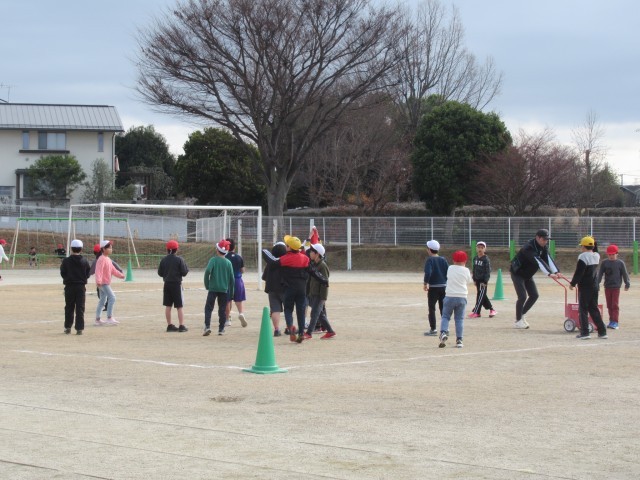 赤いサンタの帽子を被った4年生がグラウンドに。