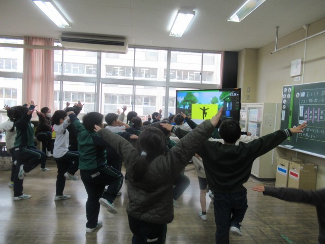 動画に合わせて、ヨガ?エアロビクス?みんなで楽しく運動しているクラス。