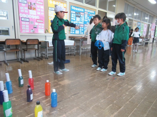 お楽しみ係がつくった、手作りの輪投げセットで、遊んでいる子供たち。