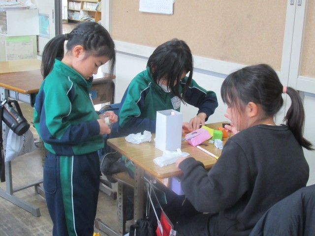手作りのくじ引きをつくって、くじを引いた友達に、これまた手作りの景品をプレゼントしている子供たち。