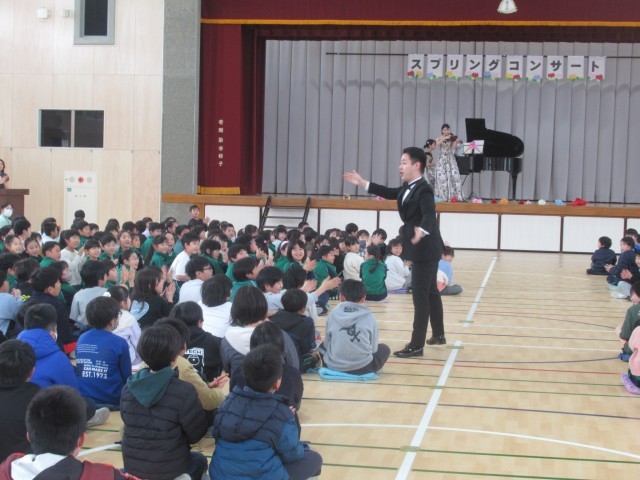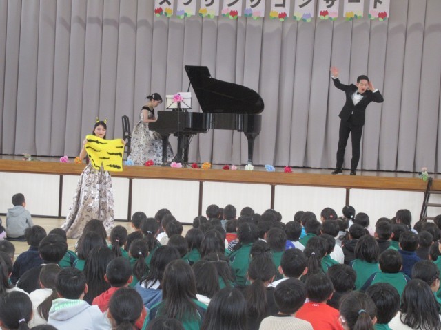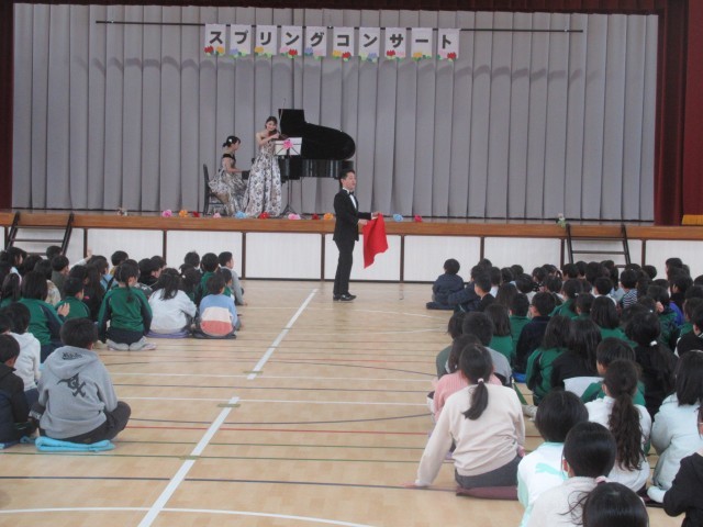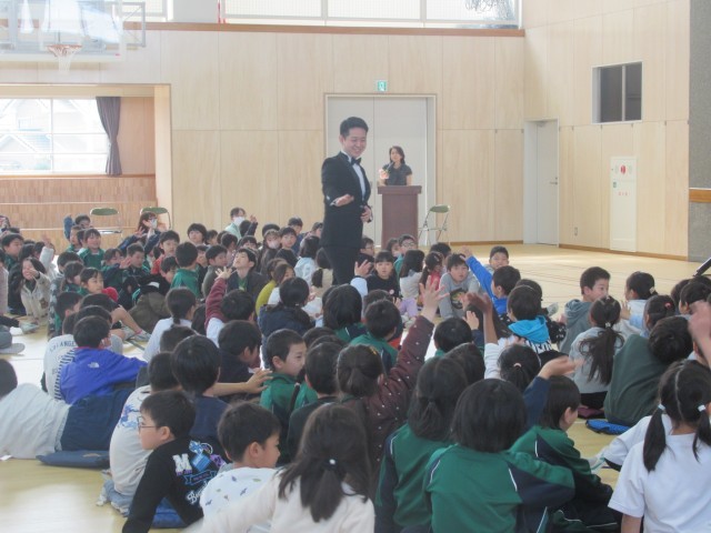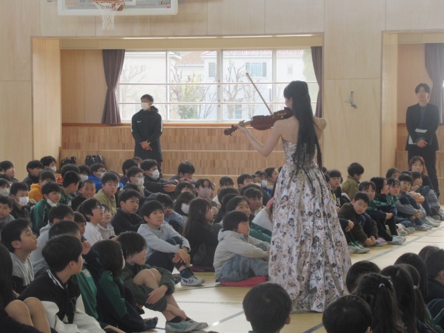 この松ケ丘小の卒業生で、今、大学で音楽を勉強している先輩がいることを知り、体育館での演奏をお願いしたところ、