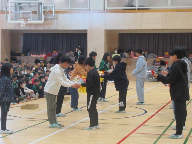 3、4年生からは、6年生一人一人に、手作りで作成してくれた、しおりや首飾りのプレゼントが手渡されました。