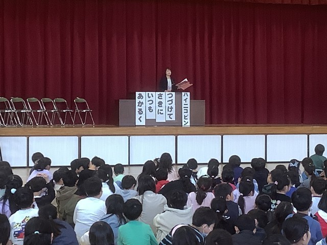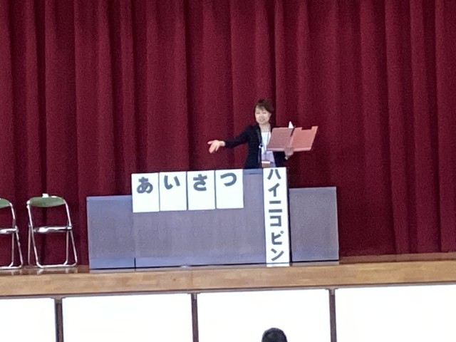 「あいさつ」の達人になる4か条と、松ケ丘小の合い言葉「ハイ・ニコ・ピン」についての話をしました。