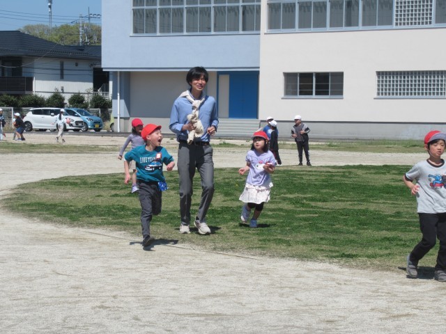 担任たちも、みな、一生懸命走り周り、おにごっこの鬼役に徹したり、かけっこ競走をしたりと、