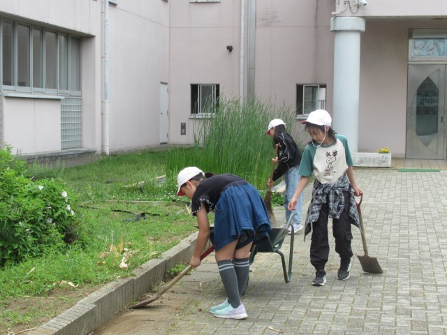 小さな草を抜き、たまった砂や土をスコップで集め、