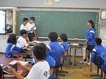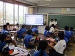 「動名詞を使った英会話」にチャレンジする2年生。ちょうど教室を訪ねたときは、1つもグループがみんなの前で英会話を披露する場面でした。「What do you enjoy doing?」の質問から英会話にチャレンジする生徒たちです!