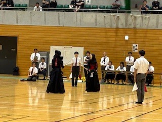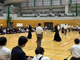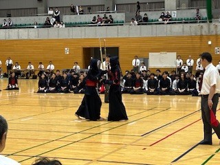 たつのこアリーナでは、女子剣道部が個人戦、男子剣道部が団体戦に臨んでいます。写真は午前中に行われた女子剣道部の個人戦の様子です。準決勝に3名の選手が残り、気持ちの入った試合を展開しています。