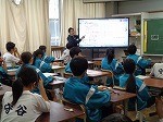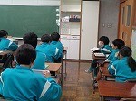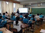 y=ー2xのグラフのかき方の振り返りをしていました。電子黒板に映し出されたグラフを見ながら、そのグラフのかき方を確認していました。電子黒板をしっかり見て、学習を進める生徒たち。集中して問題に取り組んでいました。
