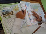 「アジア州」の学習がスタートしていました。まずは、世界地図を眺めるところから。担当の先生から「○○スタン」などの言葉の意味やシンガポールの見つけ方など、地図を眺めながら興味・関心を高める生徒たち。熱心に地図帳を見る姿が見られる1年生教室です!