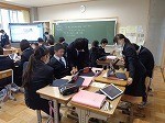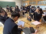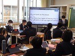 英語で「要約文をつくる」をテーマに学習を進めていました。情報がたくさん記載された英語のちらしをていねいに読み、要約を進める生徒たち。これまでの学習を活かして、わかりやすく英語で表現していました。担当の先生からもよい英文が紹介されていて、生徒たちも熱心に電子黒板を見つめていました。