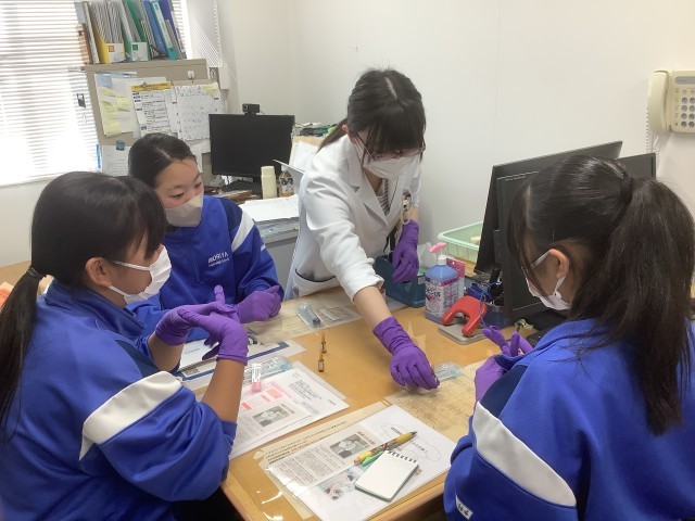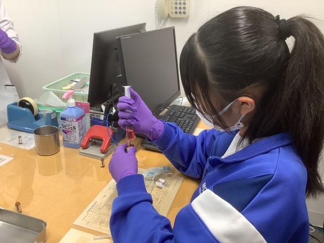 総合守谷第一病院での職場体験をする生徒たち。注射器に薬剤を入れる体験をさせてもらっています。初めて触る器具にドキドキしながらも慎重に作業を進めていました。