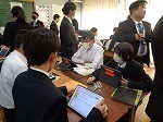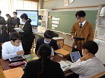 「関東地方では交通・通信を通して、他の地域と強い結び付きが見られるのはなぜだろう」」というテーマのもと学習に取り組んでいました。関東地方について調べてきたことをグループで交流する生徒たち。司会者を中心に、順番に説明をしたり、質問をしたりしながら、考えを交流させていました。