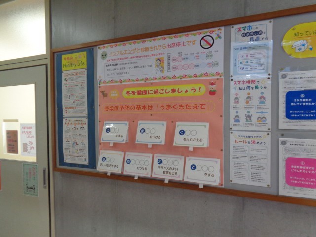 保健室前の掲示版には、この時期にふさわしい「冬を健康に過ごす」をテーマにした掲示物が掲示されていました。感染症の予防のためのコーナーが設けられており、クイズが出されていました。「く○○を入れかえる」「う○○をする」・・・など、楽しみながら感染症予防についての知識が身に付きそうです!