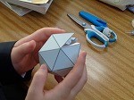 「正多面体」の学習を進めています。正多面体の立体づくりをていねいに進める生徒たち。このあと、自分のつくった立体を見ながら、その共通点や特徴をしっかりつかんでいってほしいと思います。ていねいに作業を進める生徒たちです。