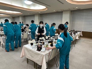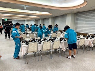 1日目の夕食前の様子です。食事係の生徒が進んで準備の手伝いをしていました。積極的に活動する姿。いいですね!