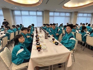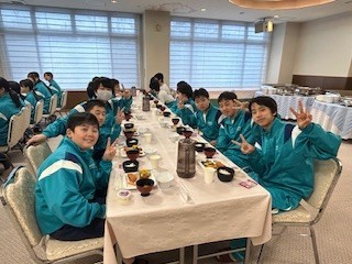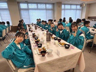 2日目の朝食の時間を迎えました。もりもり食べて、このあとのスキー実習に臨みます!今日も笑顔いっぱいの生徒たちです。