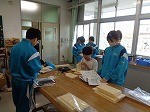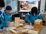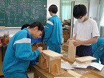 キャビネットラックやCDラックの製作を進める生徒たち。いよいよ組み立てと釘打ちが始まっていました。部材を組み合わせ、大きさを修正したり、釘をうつ準備をしたり、作品の完成に向かって前進する生徒たちです!