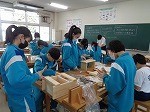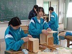 CDラックやキャビネットラックづくりも後半戦に入った1年生。仕上げのニス塗りに取り組む生徒たちもいました。多くの生徒たちがていねいに作り上げてきた部材をもとに、組み立て作業を進めています。釘をうつ音が技術室全体に響いていました!