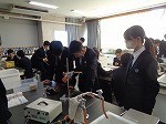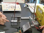 本授業は、担当の先生の指導による教育実習生の研究授業です。「電流と磁界」をテーマに学習を進める2年生。今日は、「磁界の中に入れたコイルに電流を流すとコイルはどうなるか」を追究していきました。電流を強めたり、磁石のS極とN極を入れかえてみたり、しながら実験を進める生徒たち。今日の実験の特徴や規則性に気付いたようです。授業のラストは「フレミングの法則」。電流の向き、磁界の向き。力の向きの法則をつかんでいきました!
