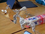 はりがねを心棒ととしてつくりあげた作品。「表したいこと」をテーマに、作品をつくりあげていました。「パンダのふわふわ感を出したい!」「ヌーが川を渡るつか強さを表現したい!」など、生徒たちのイメージは広がります。その思いを表そうと頑張る生徒たちです!